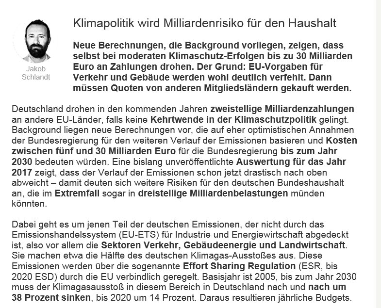 - Klimapolitik wird zum Milliardenrisiko für Bundeshaushalt – Tagesspiegel – https://t.co/Fvt8e2JhAs Selbst bei moderaten Klimaschutz-Erfolgen drohen bis zu 30 Milliarden Euro Zahlungen an andere EU-Länder. Der Grund: EU-Vorgaben werden deutlich verfehlt. https://t.co/vxx3PQLQKJ ->